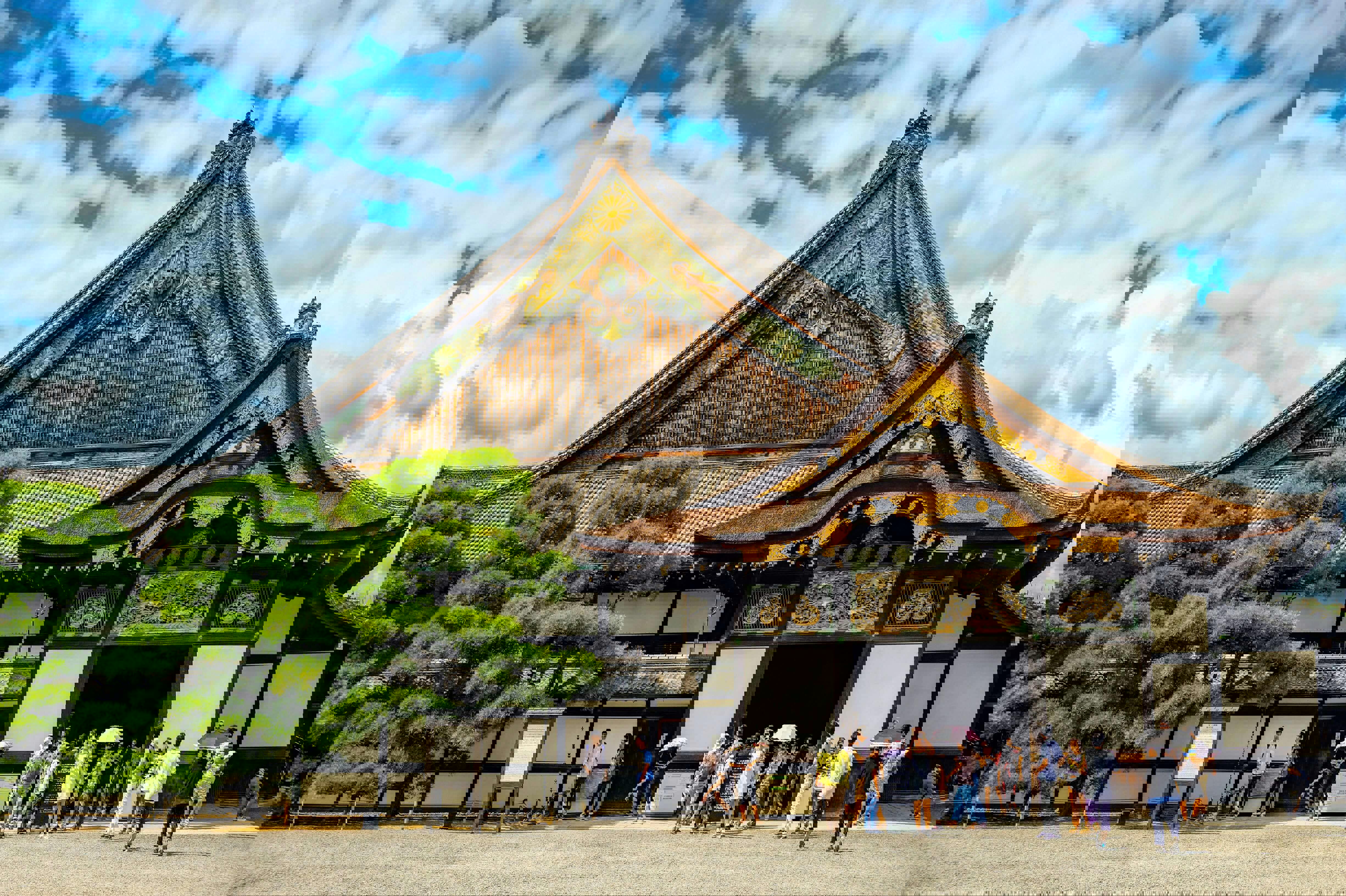 Nijo Castle byl sídlem mocného šóguna Tokugawy Iejasu a symbolizuje začátek éry Edo. Hlavní palác Ninomaru je proslulý „slavičími podlahami“, které při chůzi jemně vržou – měly varovat před vetřelci. Interiéry zdobí nádherné malby na zlatém pozadí a vyřezávané panely s motivy přírody. Hrad obklopují klidné zahrady, které na jaře rozkvétají sakurami a na podzim hrají teplými barvami.